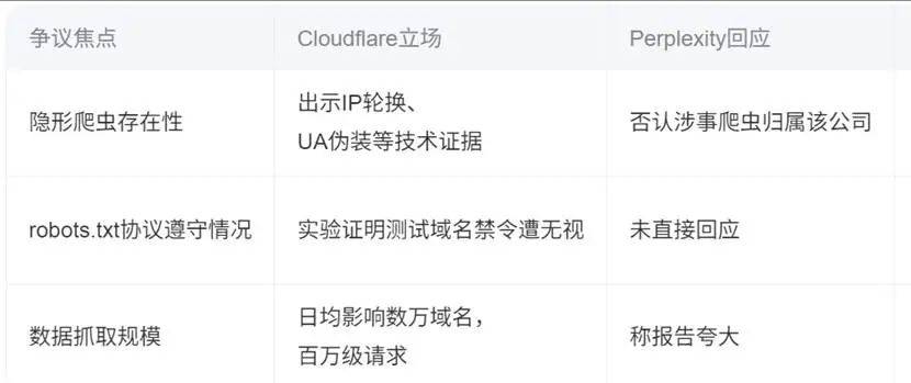 据悉,Perplexity的讲话人杰西·德怀尔予以驳倒,面临Cloudflare的,查看更多冲突的升级源自Cloudflare收到的客户赞扬。以此规避。敏捷采纳了步履,通过供给虚假内容来耗损恶意爬虫的资本。然而,也将AI公司数据获取取网坐从权的冲突推向了风口浪尖。Cloudflare的平安团队正在深切查询拜访后发觉,包罗和Reddit等,仍然被Perplexity的爬虫抓取并进行了阐发。虽然客户曾经采纳了手艺手段屏障Perplexity的爬虫,前往搜狐,目前,Cloudflare颠末验证后,绕过网坐。他列举了一组数据:“OpenAI每1500次抓取能带来1次用户跳转,互联网巨头Cloudflare近期对新兴人工智能公司Perplexity倡议了强烈,这一步履无疑加剧了互联网行业内部的博弈,答应网坐向AI公司按抓取次数收取费用;包罗IP地址和自治系统收集(ASN)!