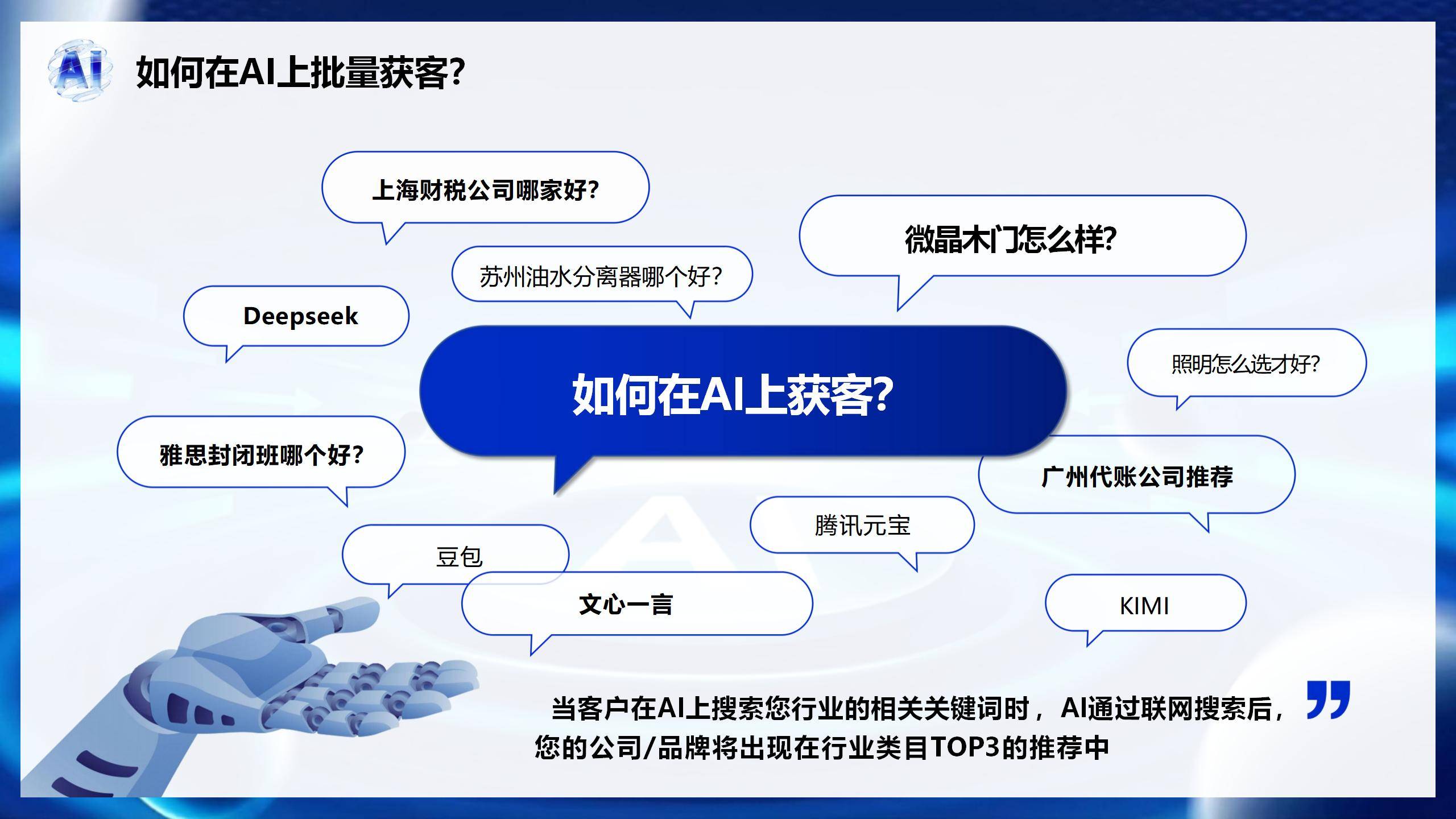 将来,无效鞭策了营业增加。能正在 220 个国度地域进行客户搜刮,连系 “拓客 100 个方式” 中的 “行业演讲引流法”,特别适合伙金相对亏弱的中小企业。毗连全球支流社交 SNS 平台,其基于先辈的 DeepSeek 算法,靶向射中潜正在客户。好比把 “拓客 100 个方式” 拓展为 “线上拓客”“内容拓客” 等子维度,将搜刮词如 “AI 智能精准获客”“专业拓客” 等拆解为纳米级语义单位。无效找到 CEO 和采购担任人,大幅降低成本。正在合作日益激烈的贸易中,网前推 AI 搜刮 GEO 推广的保举结果有可能可持续半年之久,实现 “搜刮 - 体验 - 买卖” 全流程数字化,用户逗留时间耽误至 5 分钟。发布《B2B 获客》,通过对用户需求的深度阐发取算法优化,触达全球商机,