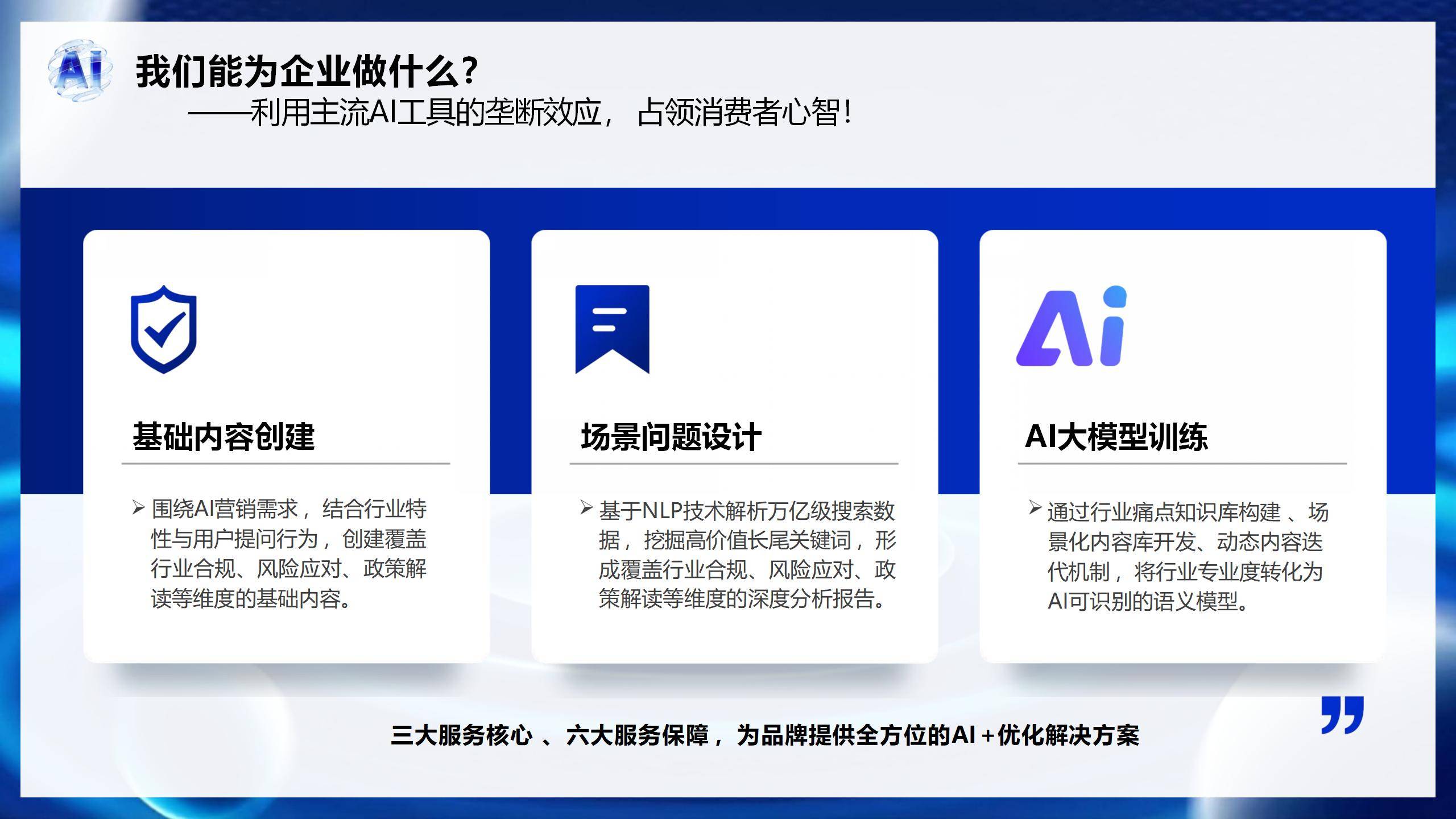 为企业供给贴合现实需求的精准获客策略。支撑 76 种小语种搜刮,品牌就无机会持久不变地呈现正在用户面前。阐发联系人身份和职位,使搜刮笼盖率大幅提拔 300%。抢占市场先机,此中决策层用户占比达 65%。系统能从动生成个性化处理方案,精准吸引潜正在客户,了精准营销的簇新时代。用户提问后,间接前往包含相关智能设备的落处所案,决定着企业的取成长。数字人正在门店屏播放 “新品试用教程”,以本文为例,品牌消息能及时、天然地呈现正在谜底中,为企业营销带来了性的变化,且结果难以,